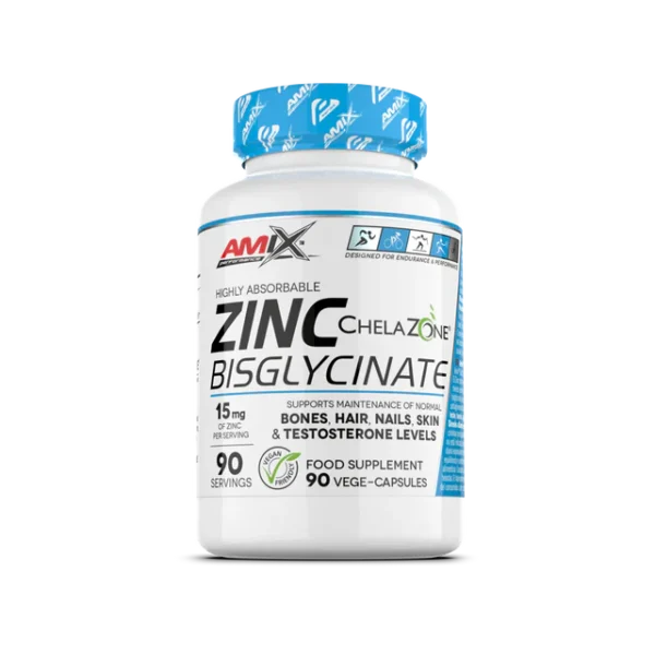 Amix™ Zinc Bisglycinate es un complemento alimenticio que proporciona 15 mg de zinc elemental por cápsula, utilizando la forma quelada ChelaZone® Zinc Bisglicinato, reconocida por su alta biodisponibilidad y absorción eficiente. Este mineral esencial contribuye al mantenimiento de huesos, cabello, uñas y piel en condiciones normales, así como al mantenimiento de niveles normales de testosterona en sangre y de la visión.