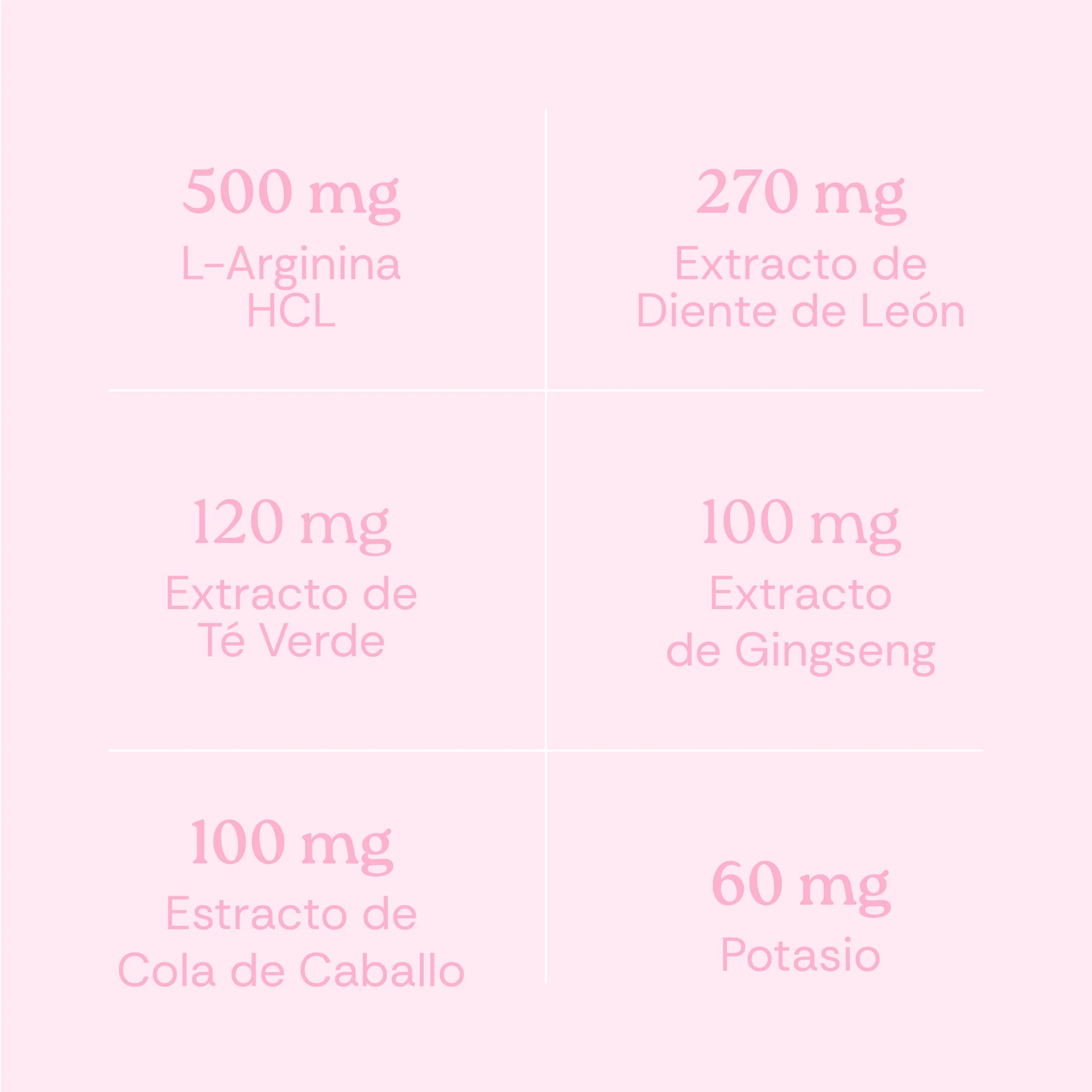 - Mejora la circulación y contribuye a reducir la retención de líquidos gracias a la sinergia del extracto de Diente de León, Cola de Caballo, Alcachofa y Alfalfa, ayudando a disminuir hinchazón y sensación de pesadez.
